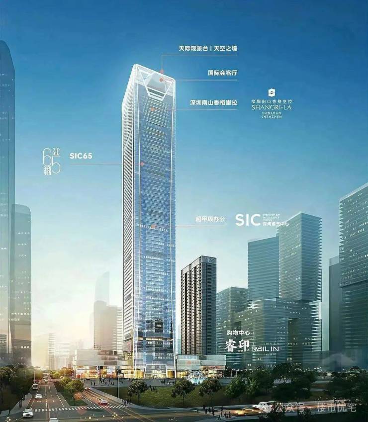358米深圳第九高楼,深超总片区首个TOD商务综合体,集购物中心、五星级酒店、超甲级办公及私邸于一体,定位“全球城市灯塔地标”