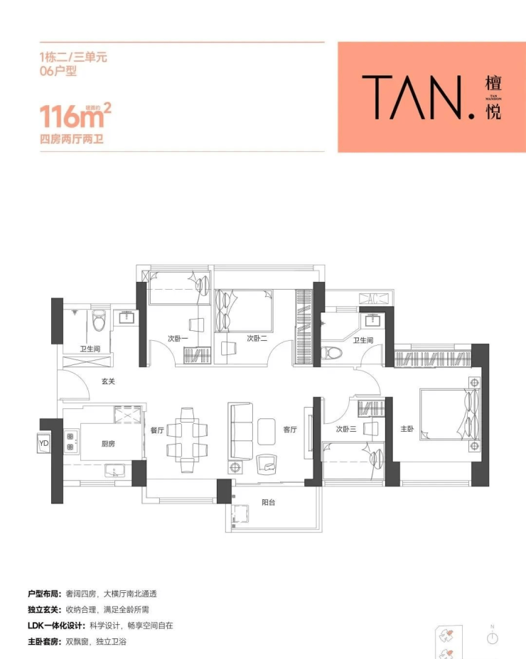 4. 116㎡的4房2厅2卫,设计的是横厅南北通透格局,LKDB一体化设计,进门入户玄关,五开间朝南,超大宽面,主卧南北通设计,U型厨房,得房率:74.35%(不含赠送),阳台主朝东南向。