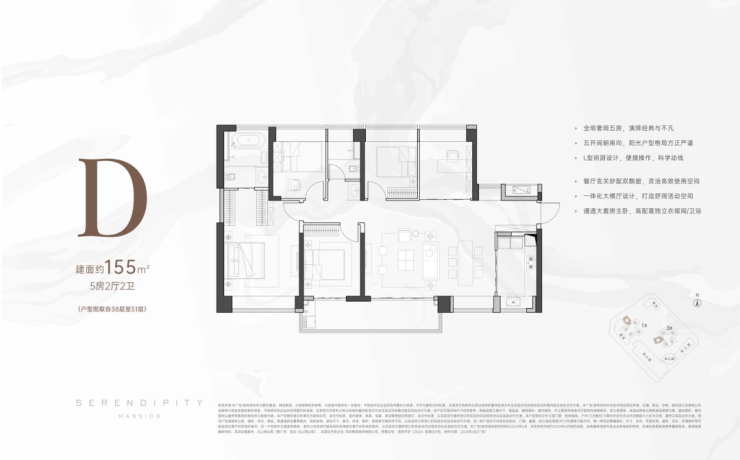 155㎡:5房2厅2卫,横厅设计格局;阳台设计更加的宽敞,客厅和次卧相连接;分布在1栋01户型,西南朝向,看港口方向;3栋01户型东南朝向,看大南山。