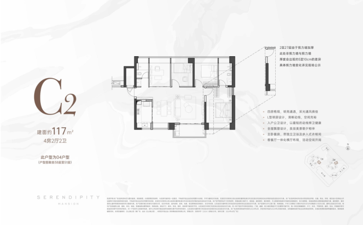 117㎡:4房2厅2卫,横厅户型,分布在1/3栋04/05,是所有户型里面空间利用最高的,阳台东南和西南两种朝向;横厅设计,南北通透,与116㎡同个面积在横厅设计,自然是可以满足南北通透的需求。