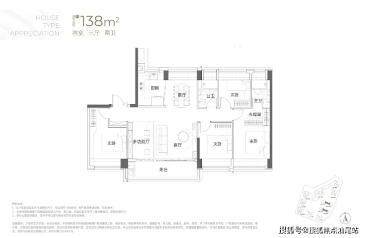 138㎡的4房2厅2卫:竖厅南北通透格局,专梯入户,客厅6.1米开间,LDKB一体化,全屋飘窗,4个卧室分别做到了3.9米/3.25米/2.9米/2.8米的宽度,主卧加1个次卧270°全景飘窗,客厅出6.1米长的大阳台,U型厨房,得房率约95-97%(包含赠送),阳台主朝西南向。138平米户型分布在3栋1单元、3栋2单元、4栋1单元、4栋2单,4个单元纯大户型。