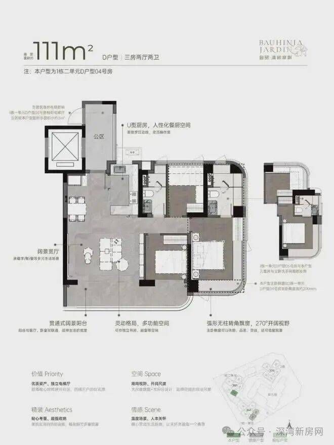 从空间布局来看,U 型厨房的设计极为人性化,大开间客厅与宽阳台是整个户型的最大亮点,西南向视野使得整个户型采光充足,贯通式阔景阳台与客厅、卧室双通,极大地拓展了生活空间的宽度。主卧的飘窗台也是一大亮点,弧形无柱转角飘窗不仅提供了广阔的视野,还增加了室内的采光。