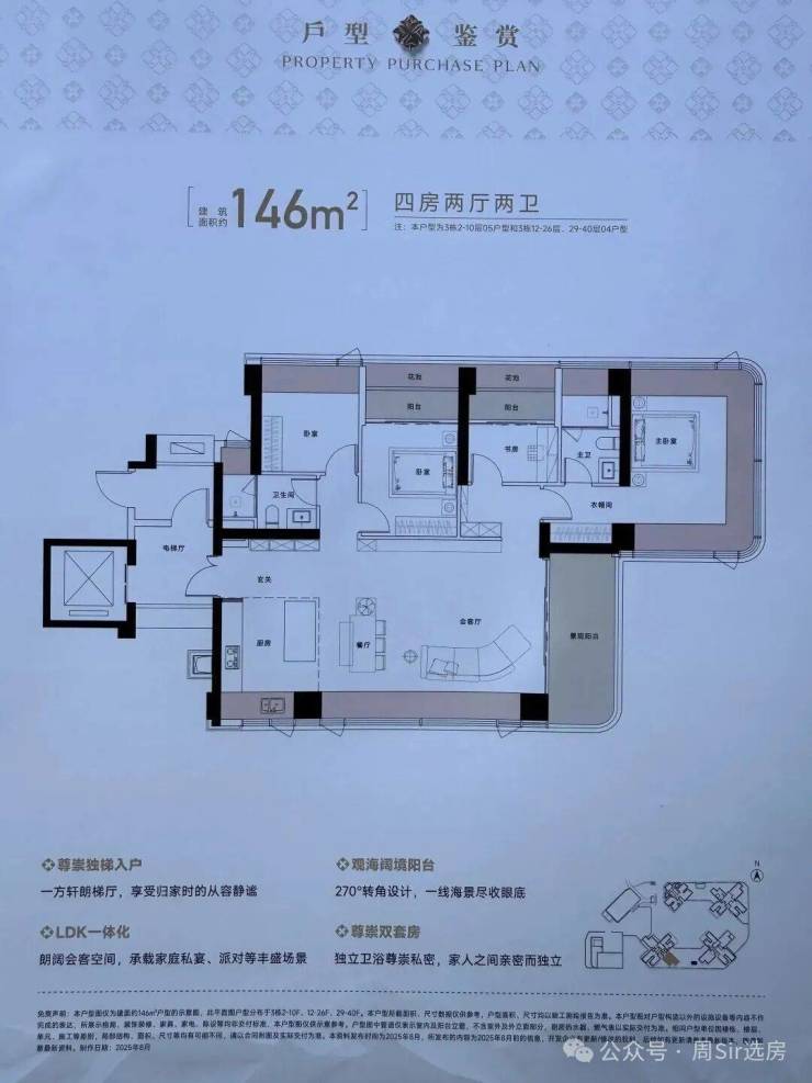 ☆建面约146㎡户型,得房率约105%(包含赠送),东南朝向看海景景观。可视为127㎡户型的升级放大版。