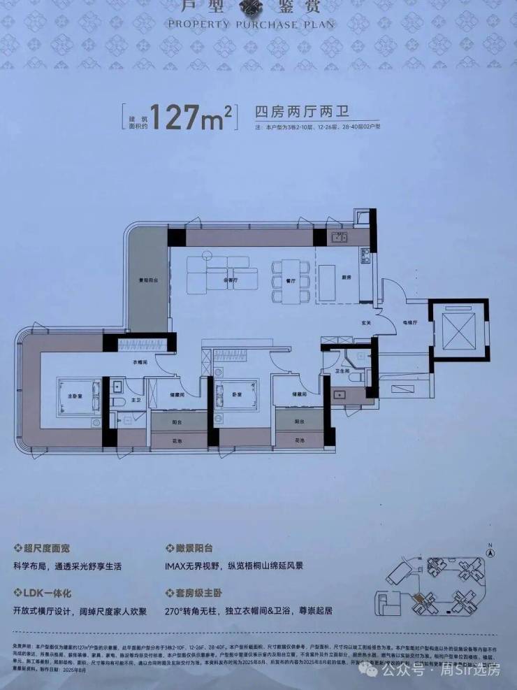 ☆建面约127㎡四房两厅两卫,得房率约105%(包含赠送),西北朝向看一线梧桐山景观。开放式横厅设计。