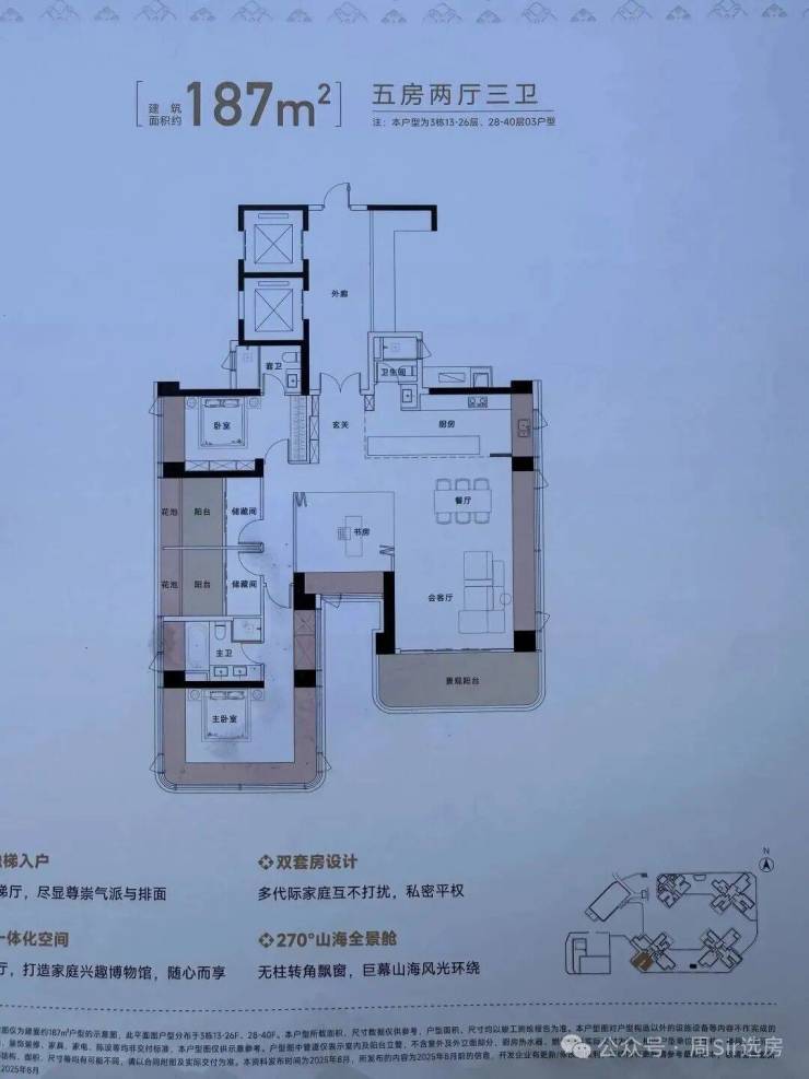 ☆建面约187㎡五房两厅三卫,得房率约111%(包含赠送),西南朝向看海景景观。双套房设计。