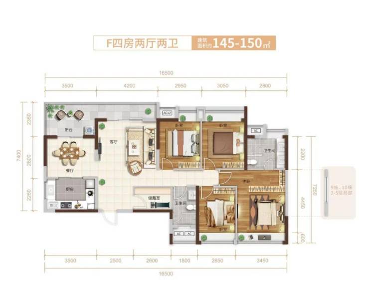F户型:145-150㎡4房2厅2卫