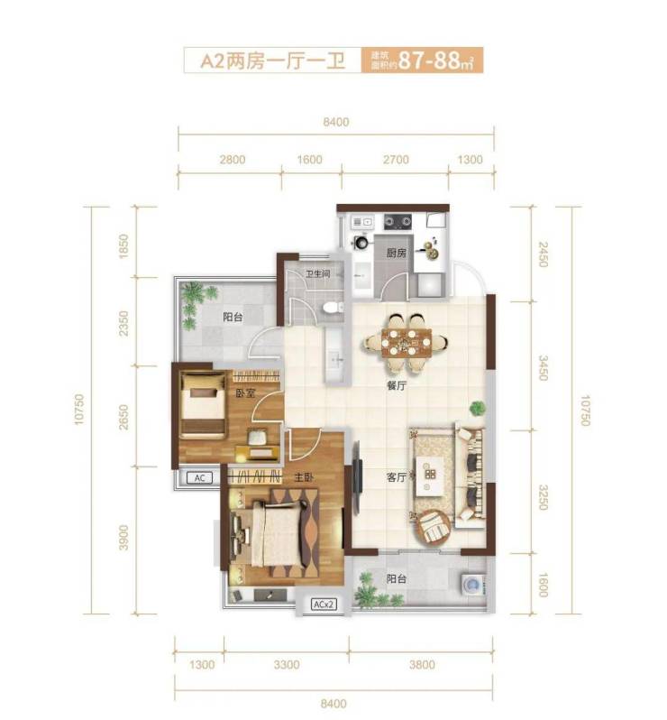 A2户型:87-88㎡2+1房2厅1卫