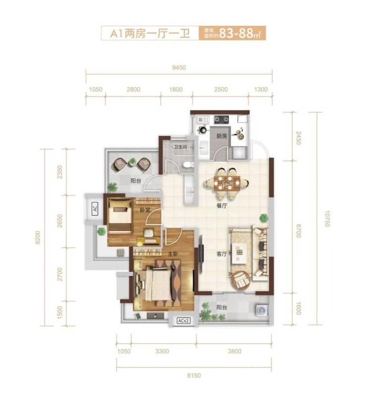 A1户型:83-88㎡2+1房2厅1卫