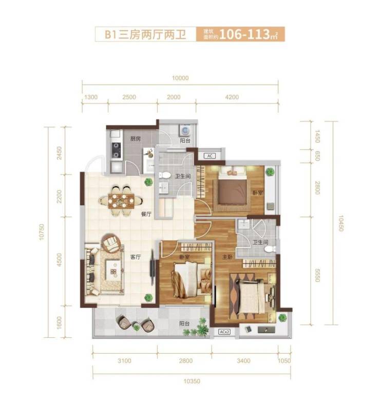 B1户型:106-113㎡3房2厅2卫