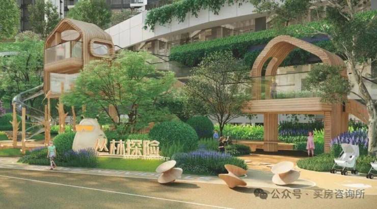 小区还对标了五星级酒店会所标准打造了约600㎡的泳池会所,配备了约10米长的儿童泳池与45米长的成人泳池,且配建了瞭望塔、树屋、攀岩墙、健身天地、功能球场等配套设施。