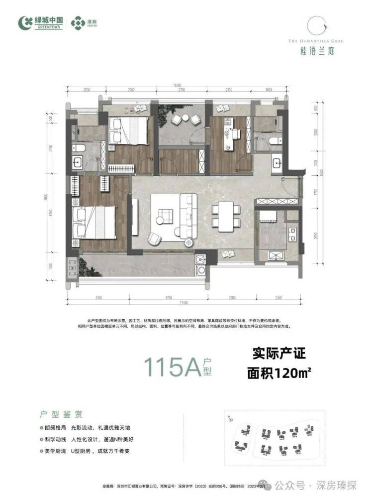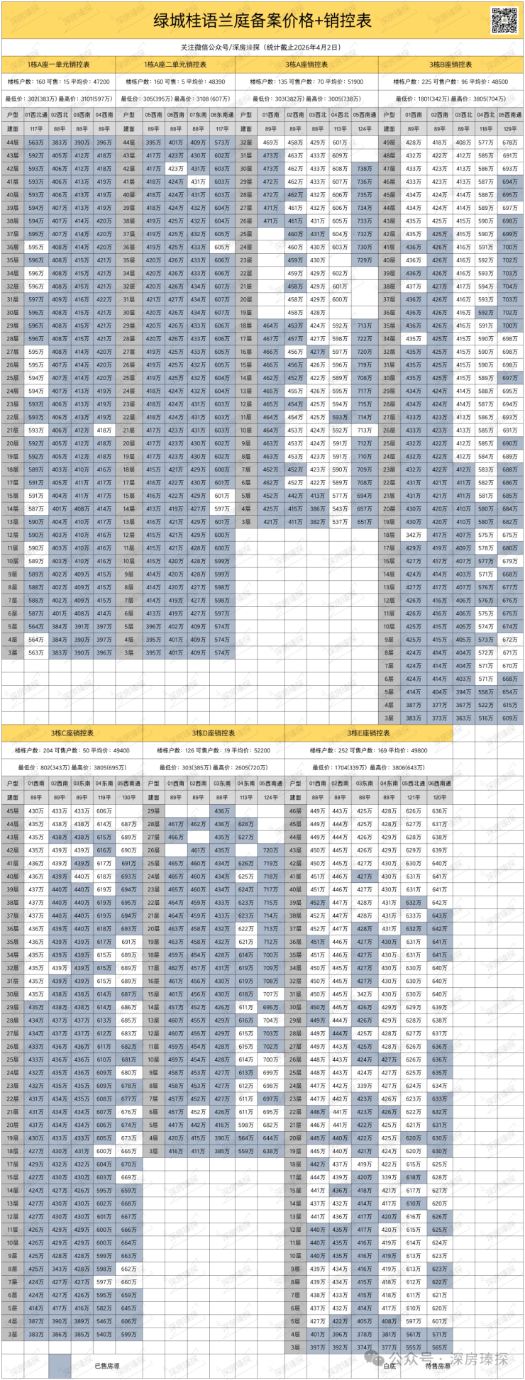 光明中心区,绿城桂语兰庭1期于2023年3月8日首推入市,本次推出3栋A/B/C/D/E座,面积有89㎡的3房2厅2卫,115-128㎡的4房2厅2卫户型,共942套房源,备案均价5万/㎡,备案单价4.07-5.93万/㎡,总价363-738万/套,当时开盘是备案价销售,现房带精装交房。