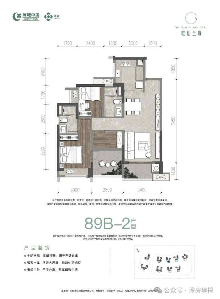 89㎡的3房2厅2卫(一期A-2户型),3栋B/C座01.02户型,设计的是经典竖厅格局,客厅3.4米开间,LDKB一体化设计,三开间朝南,动静分区,分别做到了主卧12.7㎡/次卧10.92㎡/次卧7.5㎡(包含墙体飘窗),U型厨房,卫生间干湿分离,得房率:75.2%(不含赠送),客厅约5㎡西南朝向。套内面积66.85㎡+赠送面积8.54㎡=实用面积75.39㎡,加上赠送后得房率约84.78%。