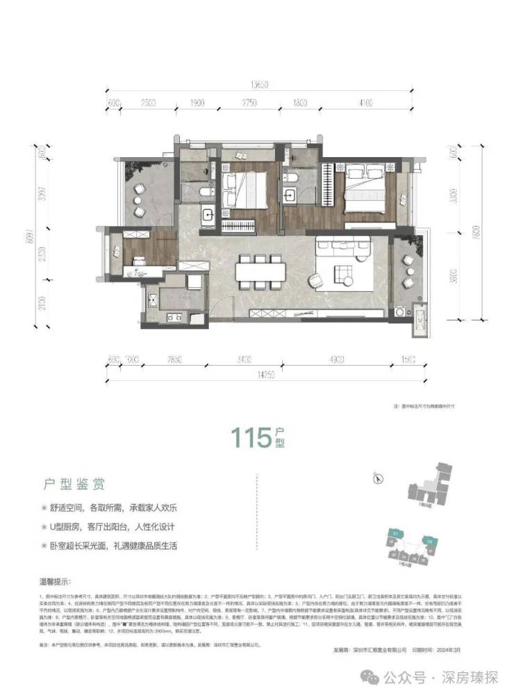 124㎡的4房2厅2卫(一期)3栋A/D座05户型,设计的是横厅南北通透格局,客餐厅6.8米开间约30.6平,LDKB一体化,分别做到了主卧17.85㎡/次卧11.4㎡/次卧10.64㎡/次卧10.26㎡(包含墙体飘窗),U型厨房,公卫三段式分离设计,得房率:78.8%(不含赠送),阳台约11.56㎡西南朝向。套内面积97.99㎡+赠送面积16.61㎡=实用面积114.6㎡,加上赠送后得房率约92.2%。