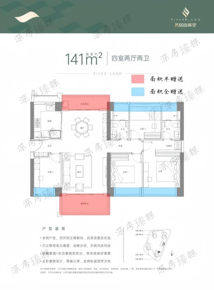 141㎡的4房2厅2卫,仅3栋2单元01户型,设计的是竖厅格局,客厅4.2米开间,南北通透双阳台,四开间朝南,全屋飘窗,4个卧室分别做到了主卧18㎡/次卧11.1㎡/次卧9.25㎡/次卧8.99㎡(套内面积,包含墙体),U型厨房,得房率:73.05%(不含赠送),大阳台主朝东南向。套内面积103.23㎡+赠送面积13.58㎡=实得116.81㎡,加上赠送后得房率约82.66%。