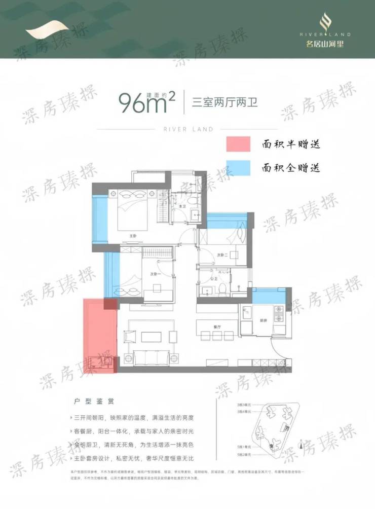 96㎡的3房2厅2卫,仅3栋2单元03户型,设计的是竖厅格局,客厅3.5米开间,三开间朝南,3个卧室分别做到了主卧12.83㎡/次卧9.24㎡/次卧7.56㎡(套内面积,包含墙体),U型厨房,得房率:73.05%(不含赠送),阳台1.6米进深,东南朝向。套内面积70.07㎡+赠送面积7.81㎡=实得77.88㎡,加上赠送后得房率约81.19%。