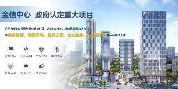金信中心由深圳市金信联投资有限公司打造,坐落于宝安区松岗街道广深公路与金芙路交汇处东北侧,占地面积约 2.2 万㎡,总建面约 20 万㎡ 。项目业态多元,涵盖生态办公、智美人居、瞰景阔宅、独栋总部与配套商业。