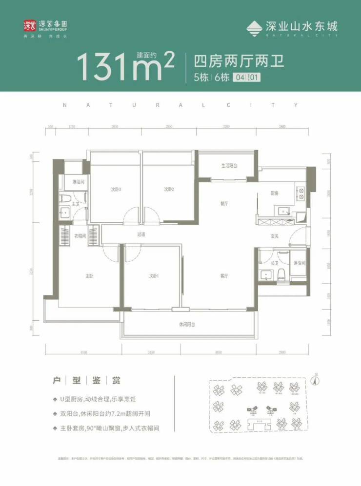 设计的是竖厅格局,客厅4.05米开间,南北通透双阳台,4个卧室分别做到了4.1米/3.15米/2.95米/2.85米的宽度,主卧大套间设计,长7.2米的大阳台,U型厨房,卫生间干湿分离,得房率:79.37%(不含赠送),阳台主朝西南或东南向。