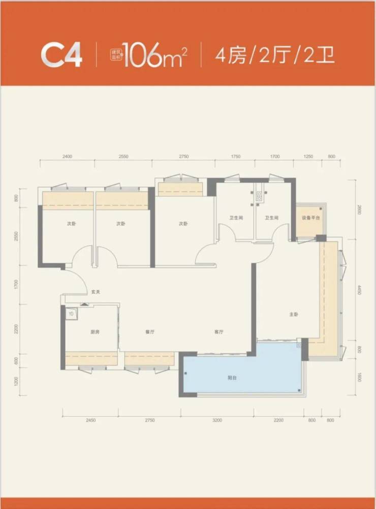 建面约106㎡的4房2厅2卫: