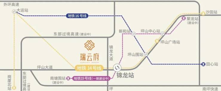 项目距离14号地铁线“锦龙站”约1.3公里,步行需要20分钟,该线路是从坪山沙田开往福田岗夏北的快速线,设计时速120公里,4站到大运,9站到布吉,10站到罗湖,12站到福田岗厦北,用时43分钟。