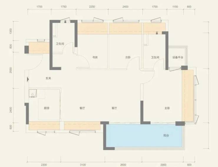 89㎡的3房2厅2卫,设计的是横厅南北通透格局,进门入户玄关,客餐厅5.7米开间,四开间朝南,3个卧室分别做到了主卧11.42㎡/次卧7.31㎡/次卧6.93㎡(实测面积,去掉墙体),主卧还带1个设备平台,主卧连接客厅出5.5米长的超大阳台,赠送面积高达20.09㎡,实际得房率约101%(包含赠送),西南/东南朝向。