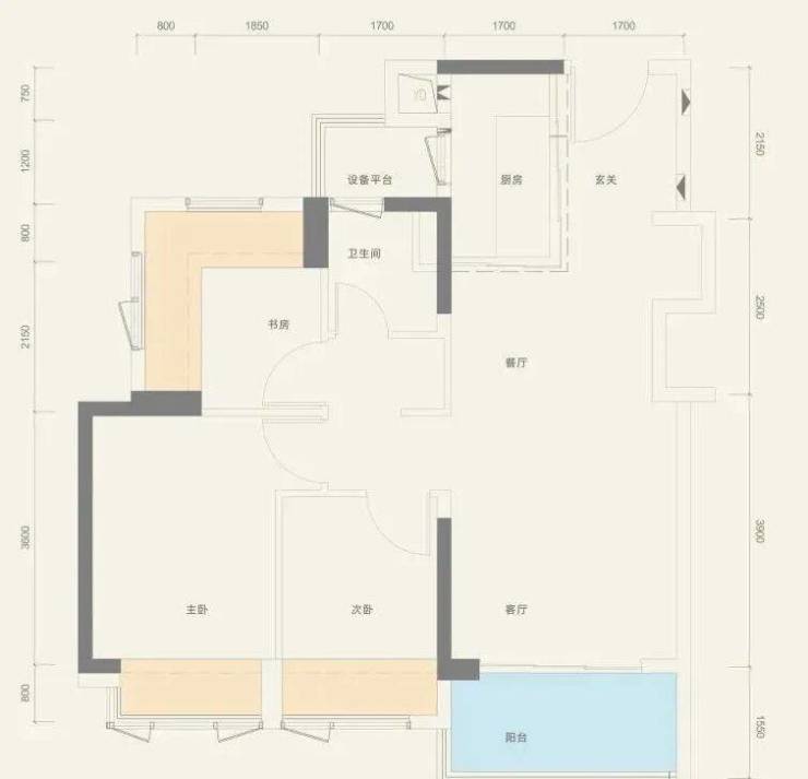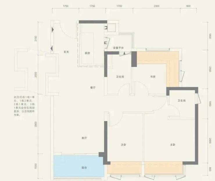 76㎡的3房2厅1卫,设计的是经典竖厅格局,客厅3.4米开间,3个卧室分别做到了主卧10.99㎡/次卧7.3㎡/次卧5.91㎡(实测面积,去掉墙体),还带1个设备平台,赠送面积高达12.71㎡,实际得房率约97%(包含赠送),西南/东南或西北朝向。