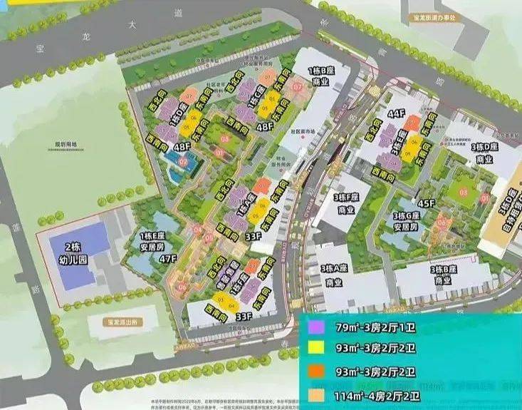 提供从79平方米的3房1卫到114平方米的4房2卫多种户型选择,得房率普遍较高,性价比优。
