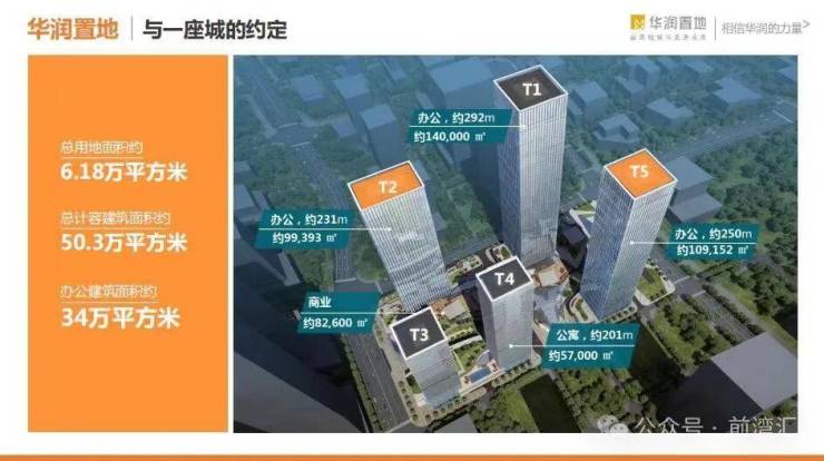 项目总投资约200亿人民币,是华润置地继城市综合体、海滨综合体、人文综合体之后的又一创新力作;项目占地面积6.18万㎡,总建筑面积50.3万㎡,由三栋国际甲级写字楼组成(T1、 T2、T5),其中T5建筑面积约109152m;建筑高度约249.4米,共53层,其中地下4层,地上包括裙楼3层为商业,6-53层为写字楼,成为前海的金融商务地标。