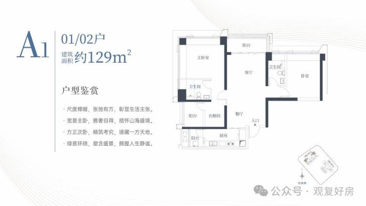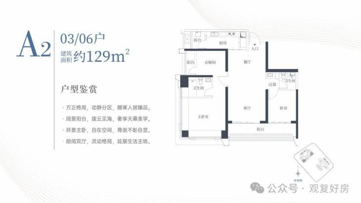 🔹124㎡的3房2厅2卫:设计的是双龙抱珠格局,客厅超大观景阳台,东南朝向,缺点有黑卫,小卧室对天井外走廊采光。