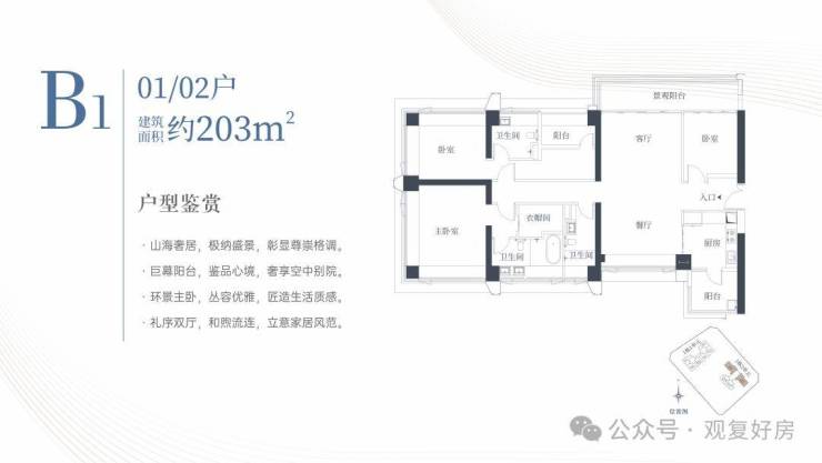 双主卧套房设置且270度景观面,同时主卧带独立衣帽间;竖厅南北通透带7.4米大阳台。
