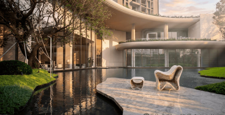 项目核心景观为5.5 万㎡三层立体台地园林,展示区即中央下沉庭院,是整个社区景观灵魂,设计理念:一心十岛、浮屿藏海、山谷秘境。展示区采用双下沉山谷式设计,区别于平面园林,利用场地高差打造高低错落、内外通透的立体景观;中央约 800㎡镜面无边水景,模拟前海潮汐海面,是展示区视觉核心;整体抬地 12 米(三层架空底盘),住宅首层相当于市政地面三层高度,完全避开道路噪音、俯瞰园林海景。全冠移植名贵乔木、多层次乔灌草,滨海耐盐树种,营造森海秘境氛围;大面积弧形石材、水洗石、木纹铝板,柔和曲线呼应海浪形态,拒绝生硬直角。