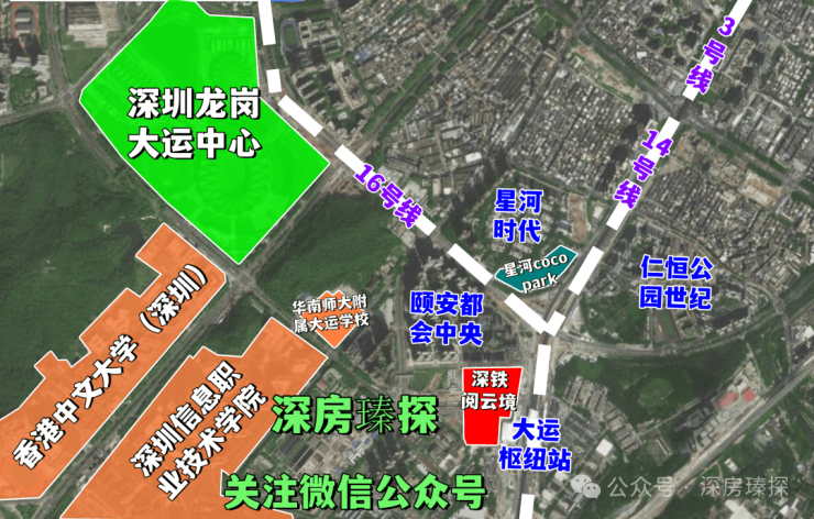 交通配套:深铁阅云境广场交通配套以"四线交汇"为核心优势,打造深圳东部最便捷的TOD交通网络 8920。项目位于大运枢纽站上盖,该枢纽是深圳东部最大的综合交通枢纽,集地铁3号线、14号线、16号线和深大城际(33号线)四线于一体,实现站内无缝换乘321。地铁3号线可直达罗湖(6站)、福田岗厦北(8站);14号线可快速到达福田中心区;16号线连接龙岗与坪山;深大城际预计2026年11月开通,可直达宝安T4枢纽(7站)和惠州大亚湾(需换乘)。