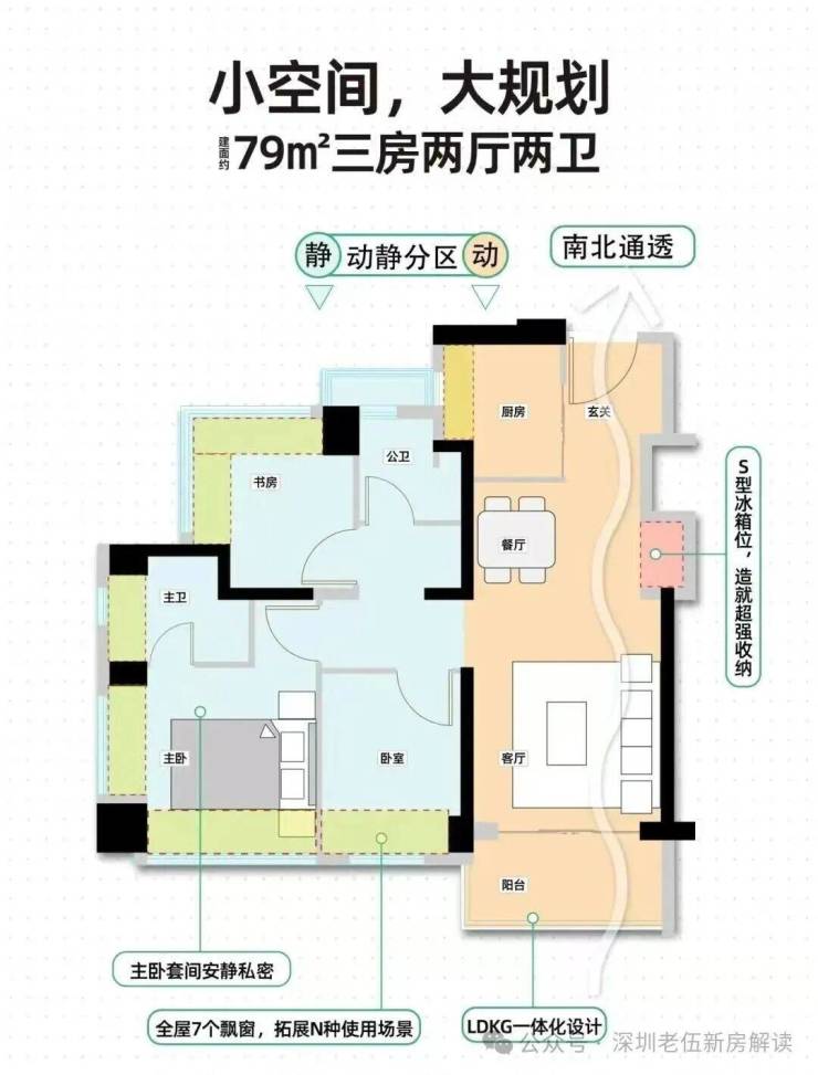 79㎡的3房2厅2卫,设计的是经典竖厅格局,客厅3.3米开间,LDKB一体化,S墙设计预留冰箱卡槽位,动静分区,三开间朝南,3个卧室分别做到了主卧12.1㎡/次卧7.36㎡/次卧6.67㎡(包含墙体飘窗),主卧+1个次卧270°飘窗设计,U型厨房,公卫三段式分离,得房率约88%(包含赠送),东南或西南朝向。