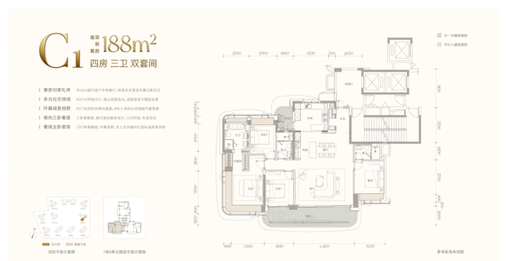 168/188㎡四房三卫:主力爆款,大横厅 + 南向超长阳台,双套房,直面园林海景。
