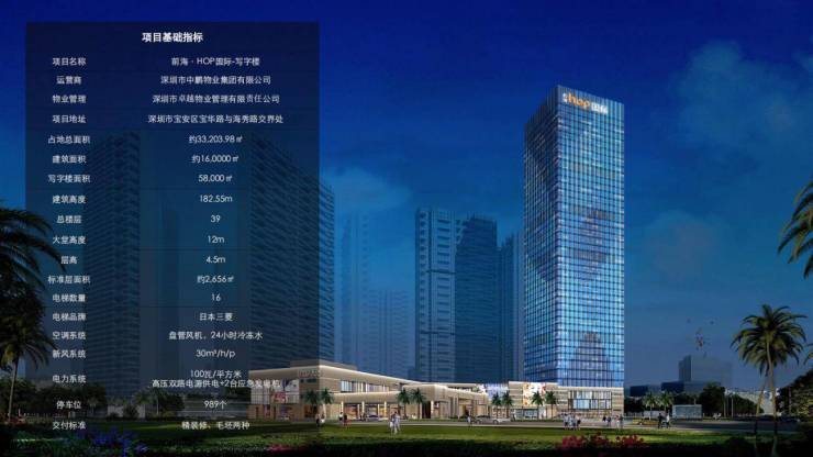深圳前海HOP国际位于前海宝中核心,是集高端购物中心、5A甲级写字楼、国际公寓、星级酒店于一体的城市综合体。项目以“绿色生态+智慧科技”为理念,打造前海商圈新标杆,汇聚商务、休闲、生活多元业态,助力区域能级提升。