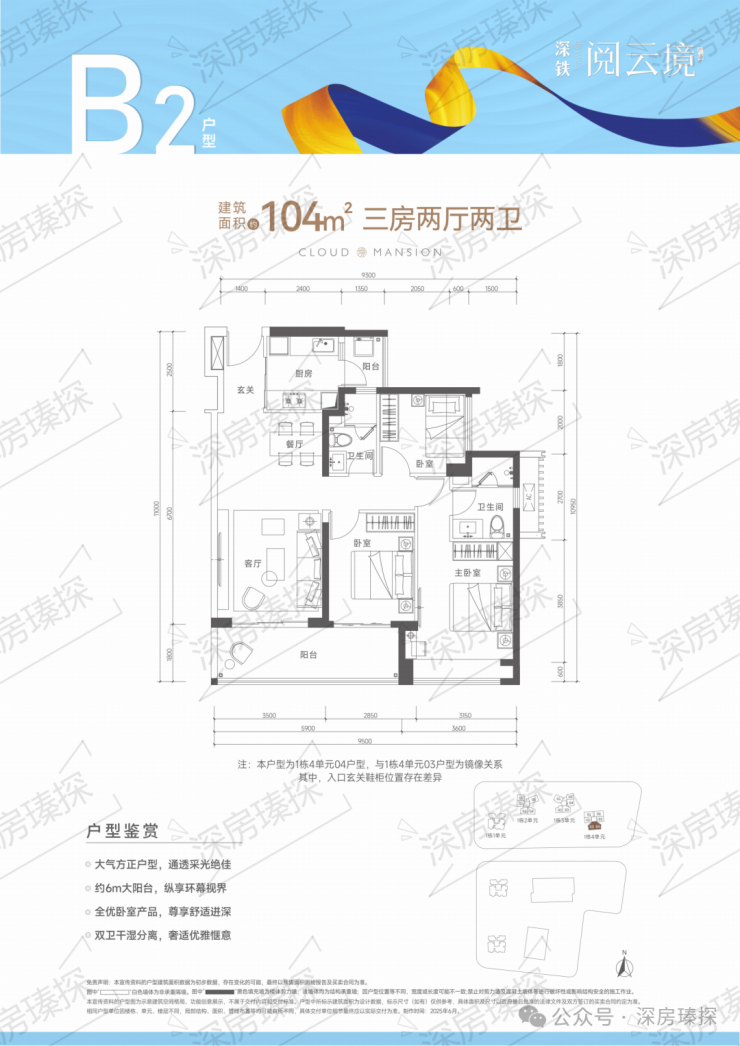 104㎡的3房2厅2卫,B2-1栋4单元03.04户型,设计的是经典竖厅格局,进门入户玄关,客厅3.5米开间,LDKB一体化,S墙设计预留冰箱卡槽位,三开间朝南,动静分区,3个卧室分别做到了主卧16.1㎡/次卧9.12/次卧6.89㎡(包含墙体飘窗),二字型厨房带1个2.43㎡大的生活阳台,卫生间干湿分离,得房率80%(不含赠送),客厅连接次卧出11.43㎡大阳台,正南朝向。套内面积82.81㎡+赠送面积10.14㎡=实际使用面积92.95㎡,加上赠送后得房率约89.45%。