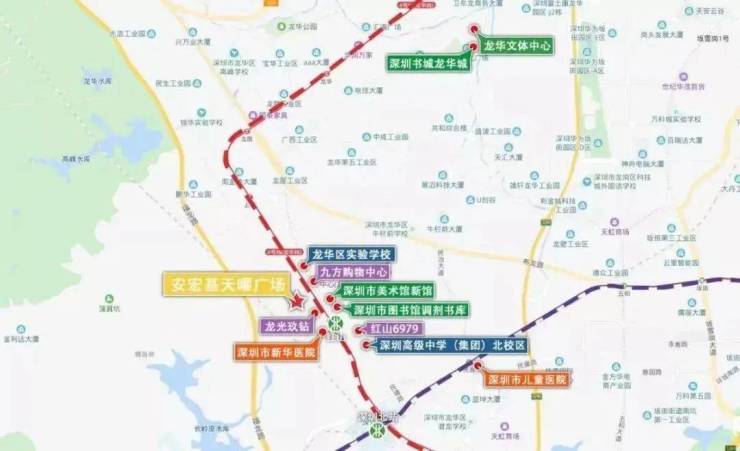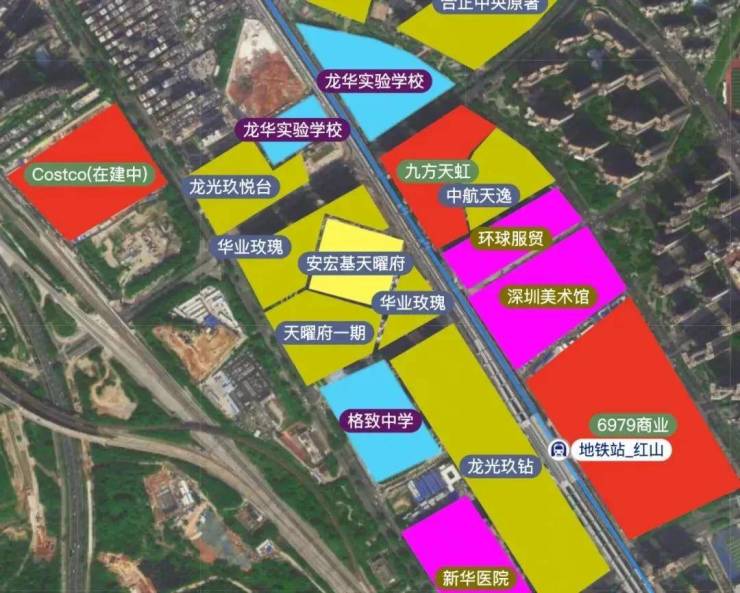 北侧为天虹购物中心,远一点有红山6979、AT MALL上塘荟、Costco华南会员旗舰店(龙华民治店)。
