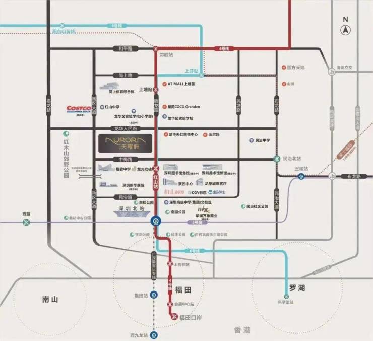 多维交通路网,距离地铁4&6号红山站约450米,通达全城。片区[五横/五纵]高密交通路网汇集,轻松实现15分钟到福田、30分钟到南山/前海。