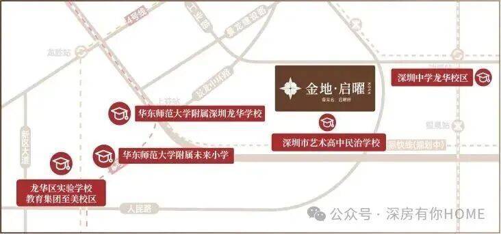 金地启曜府项目距离壹城中心商业仅一路之隔,到达4/25号线龙华站距离仅400米,未来楼盘周边也将规划两所九年制公办学校。