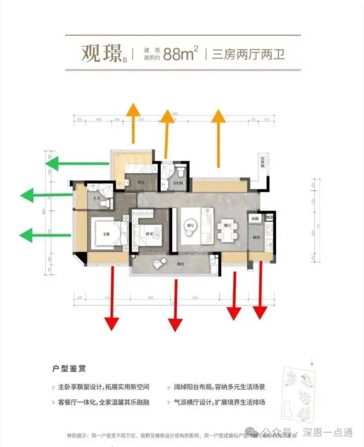这里先分析一下02的88横厅情况,88横厅红色箭头阳台,次卧,主卧西南朝向其实也是跟106一样,会夹在中间,而且这个更严重,左侧被自己的107遮挡,右侧是1栋,相比106来说88横厅这里视野更差一些,这个户型唯一优势在于格局以及使用率会比竖厅的88好