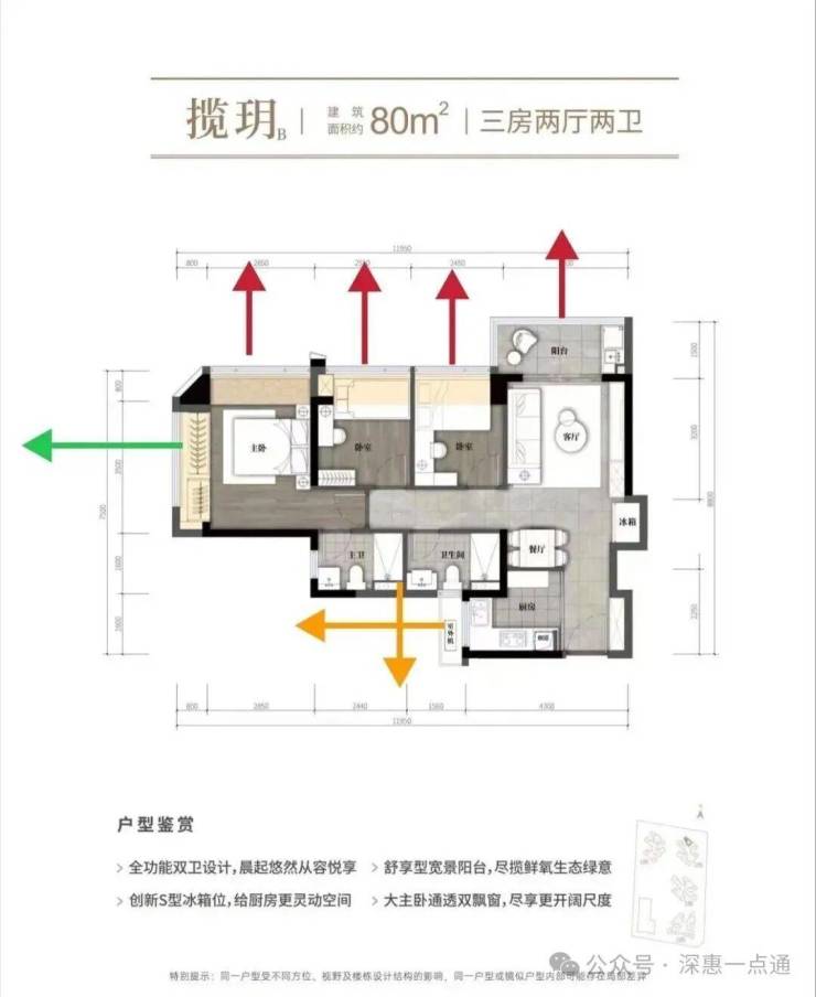 黄色箭头呢也是这里最需要注意的一点小次卧飘窗,客厅卫生间对出去是80平米的墙体还好不会对视就是遮挡问题,就是客厅飘窗有点尴尬对出去是80平米的两个卫生间