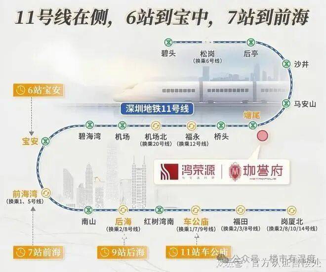 步行可达的是地铁11号线塘尾站,衡量地铁配套的价值,不能只看通勤距离,还得考虑线路串联的城市资源,11号线沿途站点都是城市地标级的综合配套,可实现6站到宝中,7站到前海,9站到深圳湾后海,11站到车公庙的快速轨道通行,可以说是“全城精华,一轨直达”。