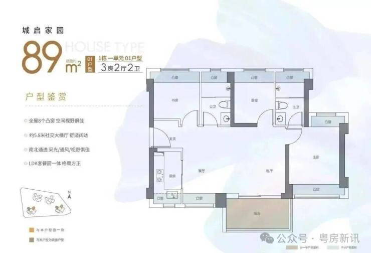 西南或东南向,户型是横厅南北通透格局,客餐厅5.8米开间,主卧双飘窗南北通设计,8个飘窗加阳台使用率在90%左右。