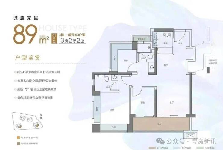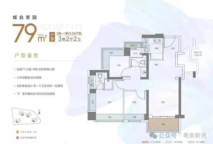 东南或西南朝向,竖厅设计,客厅有预留冰箱位,客厅,主卧,次卧分别朝南,户型一共有8个飘窗,加上阳台和飘窗使用率在90%左右。