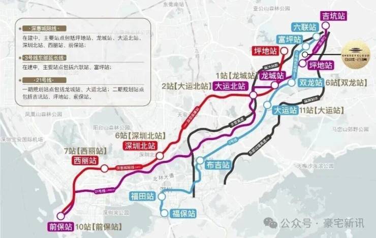 交通配套:创城云璞交通配套极为完善,地铁3号线东延线富坪站已开通,距离项目仅约200-300米,步行10分钟可达。乘坐3号线到大运站可便捷换乘14号线,30分钟直达福田中心区。深惠城际轨道线坪地站预计2026年11月开通,时速160公里,1站到龙城、2站大运北、6站到深圳北、7站到西丽、10站速达前海,实现"1小时湾区生活圈"。