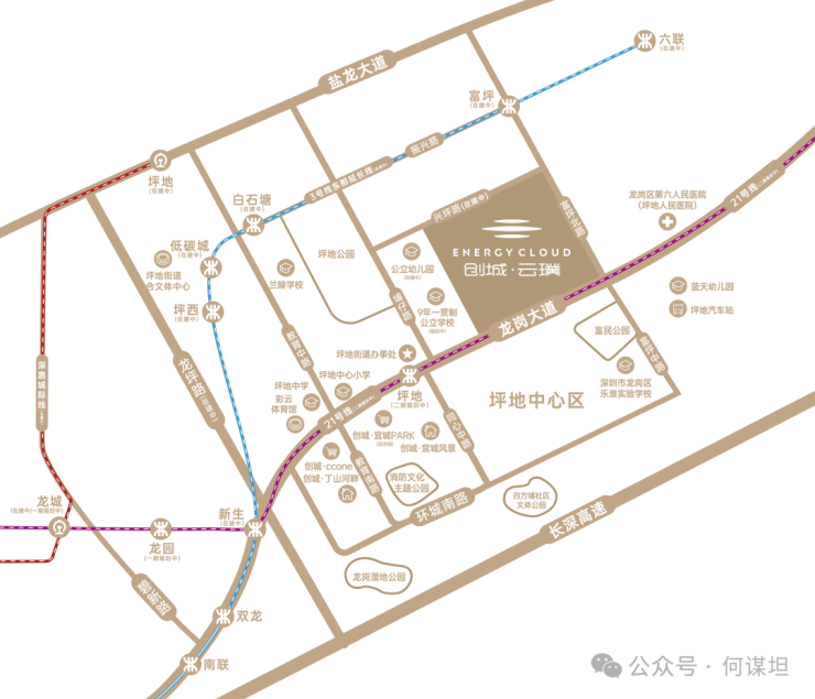 项目紧邻地铁3号线富坪站,200米是最合理的距离,龙岗中心城、罗湖都可以直达通勤,去福田可以在中心城转14号线,去南山有深惠城轨,今年即可开通,仅7站直达南山,可以说,虽然给人的感觉坪地地处城市边沿地带,但其交通却极其便利,走盐龙大道10分钟可上水官高速、机荷高速,40分钟之内可以抵达福田、罗湖等地,且外联深圳外环高速、长深高速,快速通达四方。