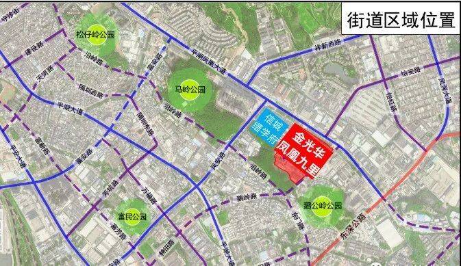 金光华凤凰九里位于龙岗区平湖街道凤凰大道与鹅岭路交汇处西侧,项目北侧紧挨凤凰大道,西侧是正在动工的信城缙学府,东南侧是鹅公岭社区公园,当前距离最近的10号地铁线“双拥街站”距离约3公里。