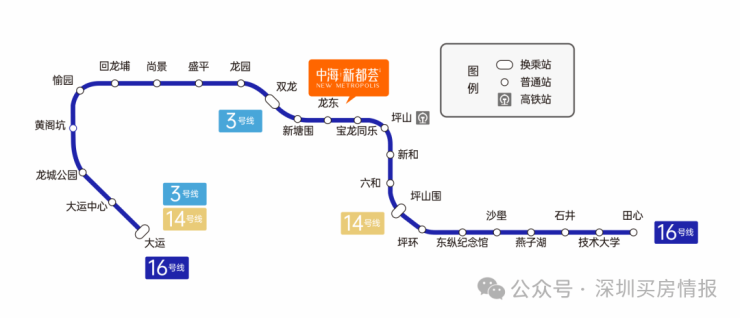项目步行至地铁16号线龙东地铁口约50m,可通过16号线链接坪山高铁中心、龙岗中心城、大运中心