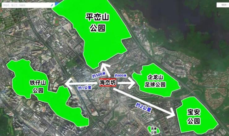 海峦坊1公里范围内有平峦山公园,企龙山足球公园,铁仔山公园,在2公里范围内还有宝安公园,闲时饭后散散步,溜溜娃,周末带上亲朋好友,一起露营,散步观景,也都是不错的选择。