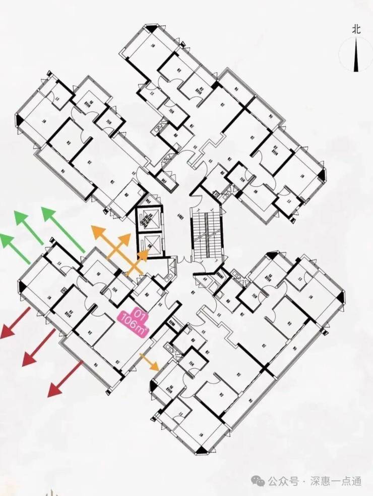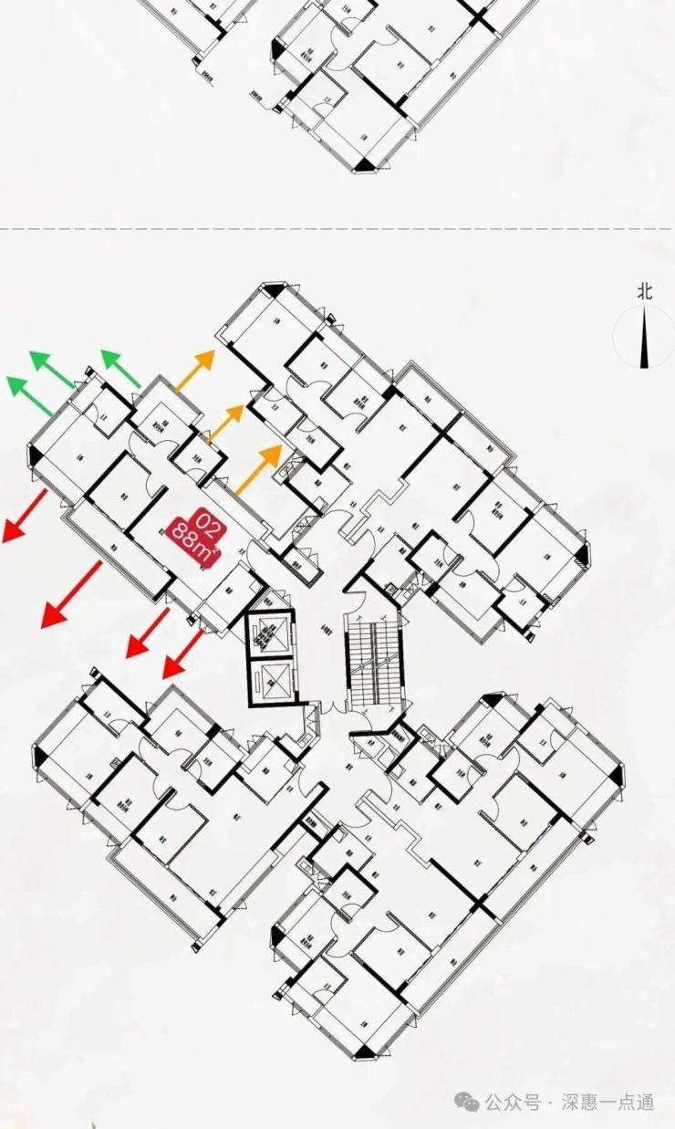 最后再来说一下黄色箭头情况这里是比较需要注意的点这里可以看一下这个楼栋平面图,其中书房次飘窗,客厅卫生间看出去是天井墙体,所以书房做了是双面采光这里还好,卫生间可能影响一点,客厅飘窗也会有跟06户型88平米的书房对视遮挡问题,这里后续可以通过其他问题解决