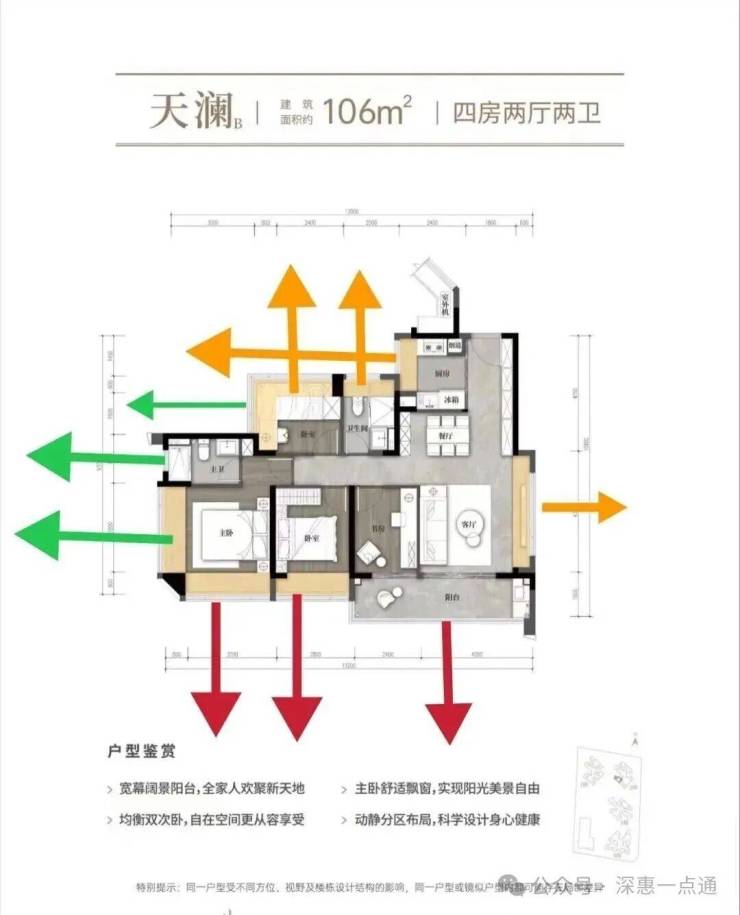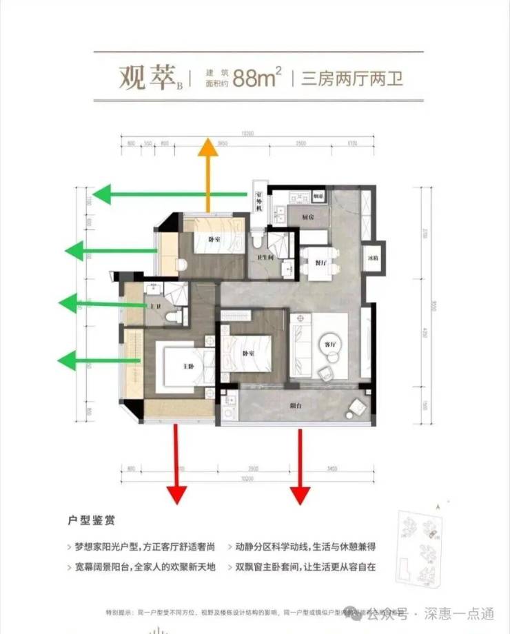 这里先分析一下02的88横厅情况,88横厅红色箭头阳台,次卧,主卧西南朝向其实也是跟106一样,会夹在中间,而且这个更严重,左侧被自己的107遮挡,右侧是1栋,相比106来说88横厅这里视野更差一些,这个户型唯一优势在于格局以及使用率会比竖厅的88好